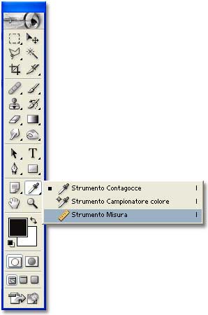 Nel caso più fortunato, sarà necessario solo ruotare l'immagine, ed è il caso che si presenta, per esempio, se si fa una scansione posizionando l'originale in modo poco accurato sul piano dello scanner. Il metodo migliore, per ruotare l'immagine con precisione, è quello di ricorrere allo strumento Misura. (Come in ArchiCAD, anche in Photoshop alcuni strumenti possono occupare la stessa posizione nella palette strumenti. Se lo strumento Misura non è visibile, fate un click prolungato sullo strumento Contagocce, e trascinate per selezionare lo strumento Misura.)