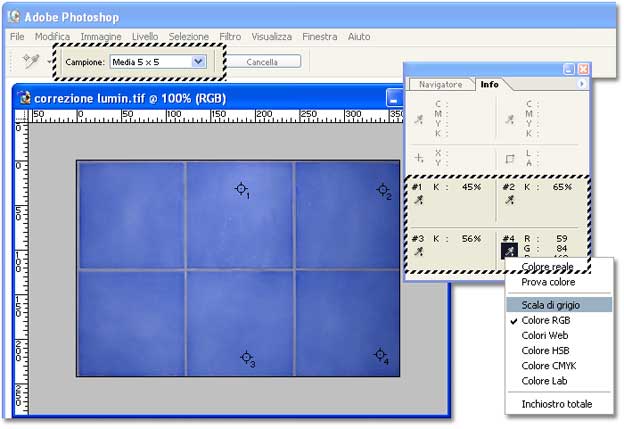 Colloco i punti campione in varie posizioni; per semplicità di lettura, li distribuisco in modo analogo a come compaiono nella palette: il primo in alto a sinistra, il secondo alla sua destra, ecc. Cliccando sul piccolo contagocce, nella palette Info, scelgo la modalità di misura "Scala di grigio", che presumo offra la migliore informazione sulla luminosità. Notate che nella barra in alto, nel menu Campione, ho scelto l'opzione "Media 5x5", perché sarebbe del tutto inutile avere la misurazione effettuata su un singolo pixel arbitrario. Ora, usando gli strumenti Scherma (per aumentare la luminosità) e Brucia (per ridurla), schiarisco o scurisco leggermente le varie aree dell'immagine, finché l'indicazione fornita dai campioni risulta omogenea. È importante usare un pennello molto grande e sfumato, ed applicarlo con passate successive molto "leggere", per evitare segni antiestetici.