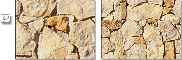 Tenendo aperti i due documenti insieme, uso lo strumento Lazo per selezionare con cura dall’originale alcune delle pietre che risultano tagliate nella mia texture. Naturalmente lavoro con un forte ingrandimento, e cerco di comprendere nella selezione anche le ombre che circondano e definiscono la pietra. Quindi copio la selezione e la incollo sulla texture, spostandola nel punto giusto con lo strumento Muovi (posso anche trascinare con Ctrl, o Comando su OSX, senza cambiare strumento).