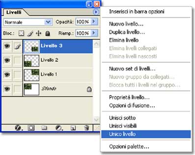 Per mezzo delle caselle in basso (Ancoraggio) stabilisco la posizione dell’area originale, rispetto alle nuove dimensioni. Infine incollo tre copie dell’immagine, spostandole con lo strumento Sposta, in modo da coprire l’intero quadro. Ogni volta che si incolla un elemento, in Photoshop, si crea un nuovo livello (analogo ai Lucidi di ArchiCAD). Quasi tutte le operazioni agiscono solo sul livello corrente. Per semplificarci il lavoro, conviene unificare l’immagine, usando il comando Unico livello del menu che si apre cliccando in alto a destra, nella palette Livelli.